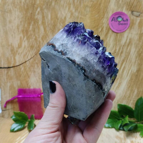 Spirituele werking: Amethyst creëert een veld met lichtenergie om zich heen die (wanneer de steen groot genoeg is) je aura of zelfs de ruimte kan reinigen. het kan de kruin en het derde oog openen waardoor de steen geschikt kan zijn voor mensen die hun intuïtie of spirituele vaardigheden verder willen ontwikkelen. Helpt met contact maken met hogere energieën en gidsen en is daarom een goede steen ter ondersteuning van meditatie.