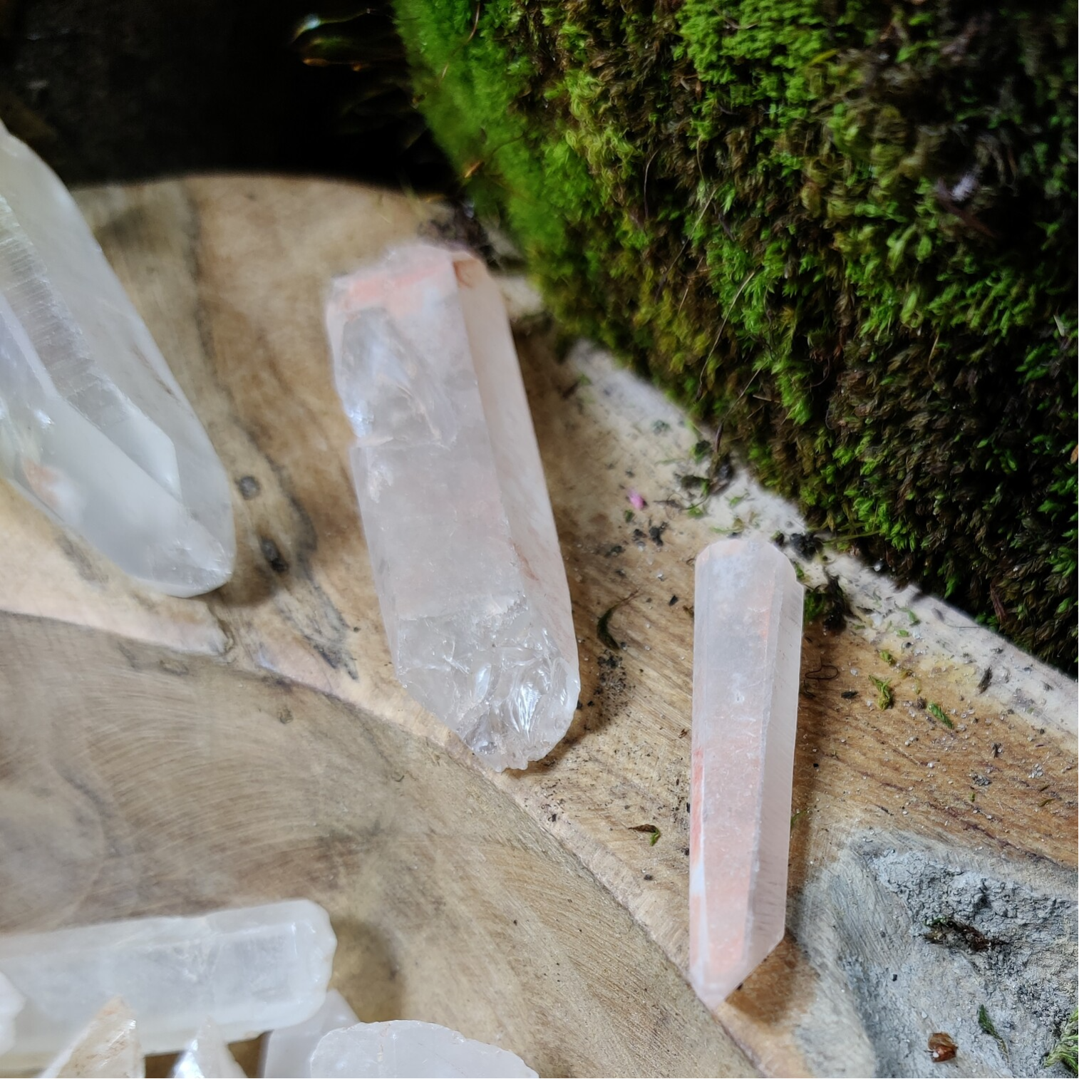 Kleine bergkristal puntjes met ijzer en een lengte van ongeveer 3 tot 4 cm. De breedte van de punten is ongeveer 0,5 cm tot 1 cm.